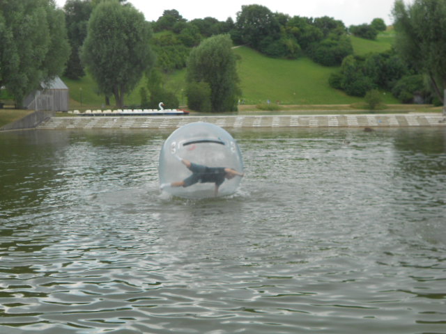 De vuelta al Centro pasas por Maximilianstraße (la Milla de Oro de la ciudad) y una firma supercara inaugura una tienda. Un cocktail para invitados superchic. Y una cafetera que vale 18000 €. Y uno que se ha colao con sus bermuditas y su camiseta sudá y que se está comiendo un plato de no sé qué entre aquella gente…lo siento, pero desde que me colé en el Negresco no puedo evitar codearme con la alta alcurnia. Vuelve en sí que allí no pintas ná que nos vamos al Englischer garten, el parque urbano más grande de Europa (yo ni lo he medido tan siquiera, pero aquí les encanta eso de etiquetar con «lo más….de»). Si llegamos a empezar el día por aquí no veo (ni ves) nada más, me hubiese pasado aquí el día a remojo en una especie de arroyo con potente corriente que cruza el parque, donde incluso hacen surf. Como ya no son horas de echar fotos, que está casi anocheciendo, te pongo una foto de otro parque con lago con personas-en-bolas.