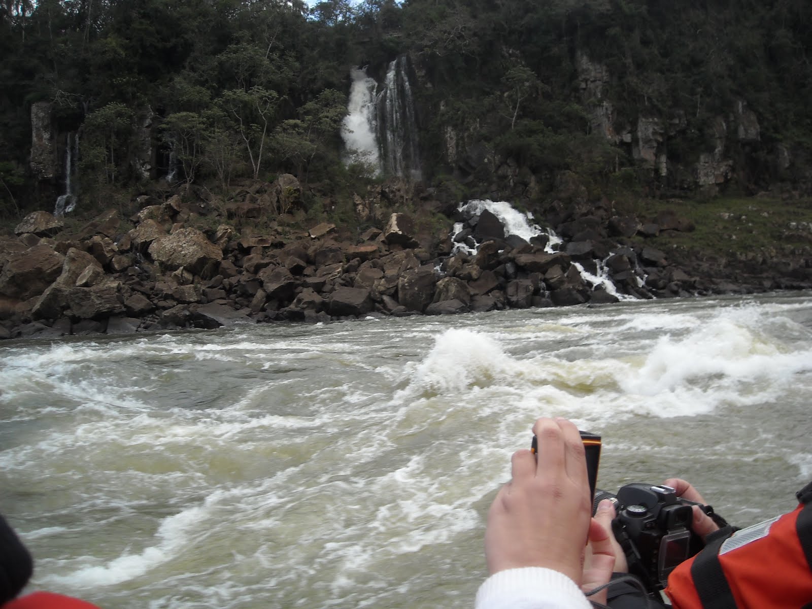 A bastantes metros ya empieza la lluvia a caer sobre la lancha, y se acerca más y más, y yo esto ya lo viví en Niágara (vd. entrada nº19 con la etiqueta de Ontario) y vengo preparado: me quito las botas, las meto en el saco impermeable, me ato dos bolsas del Mercadona cuán elegantes mocasines, me pongo una gorra encima del gorro, y, encima de la gorra y del parca, un impermeable. ¡ Hala, preparado¡… se creían que me iban a asustar, pobres.
